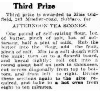 First prize is awarded to Miss Oldfield, 243 Mueller-road, Subiaco, for recipe